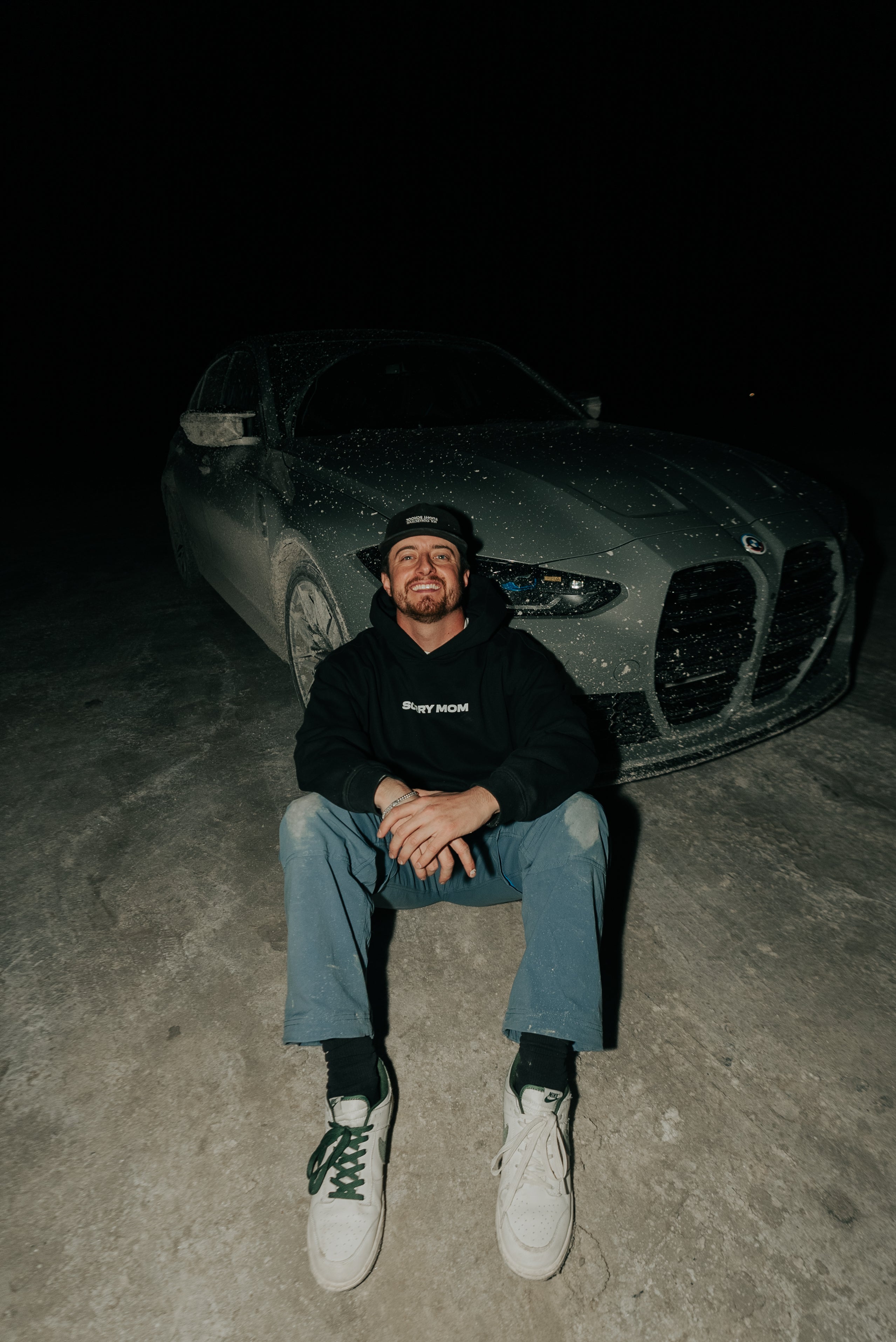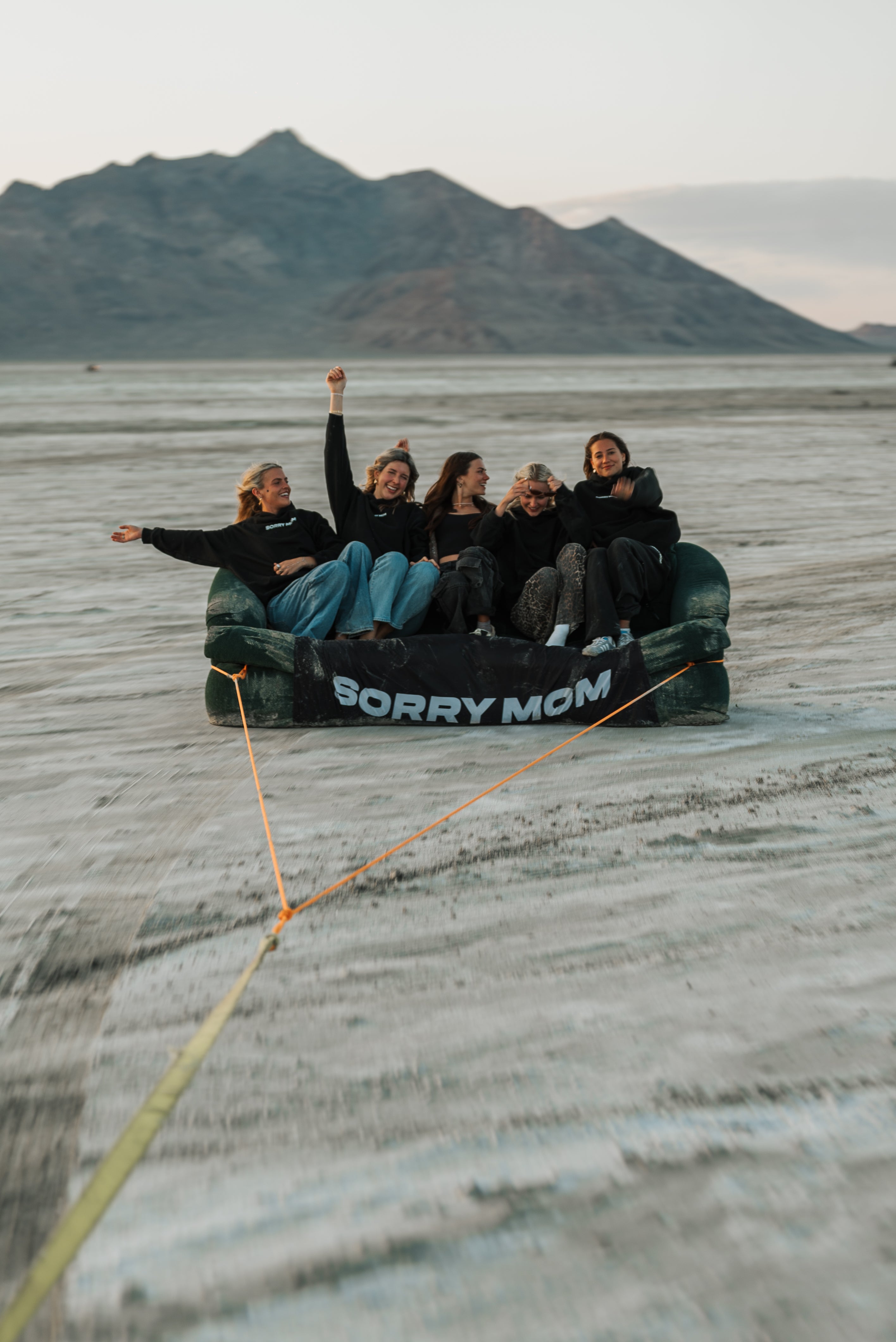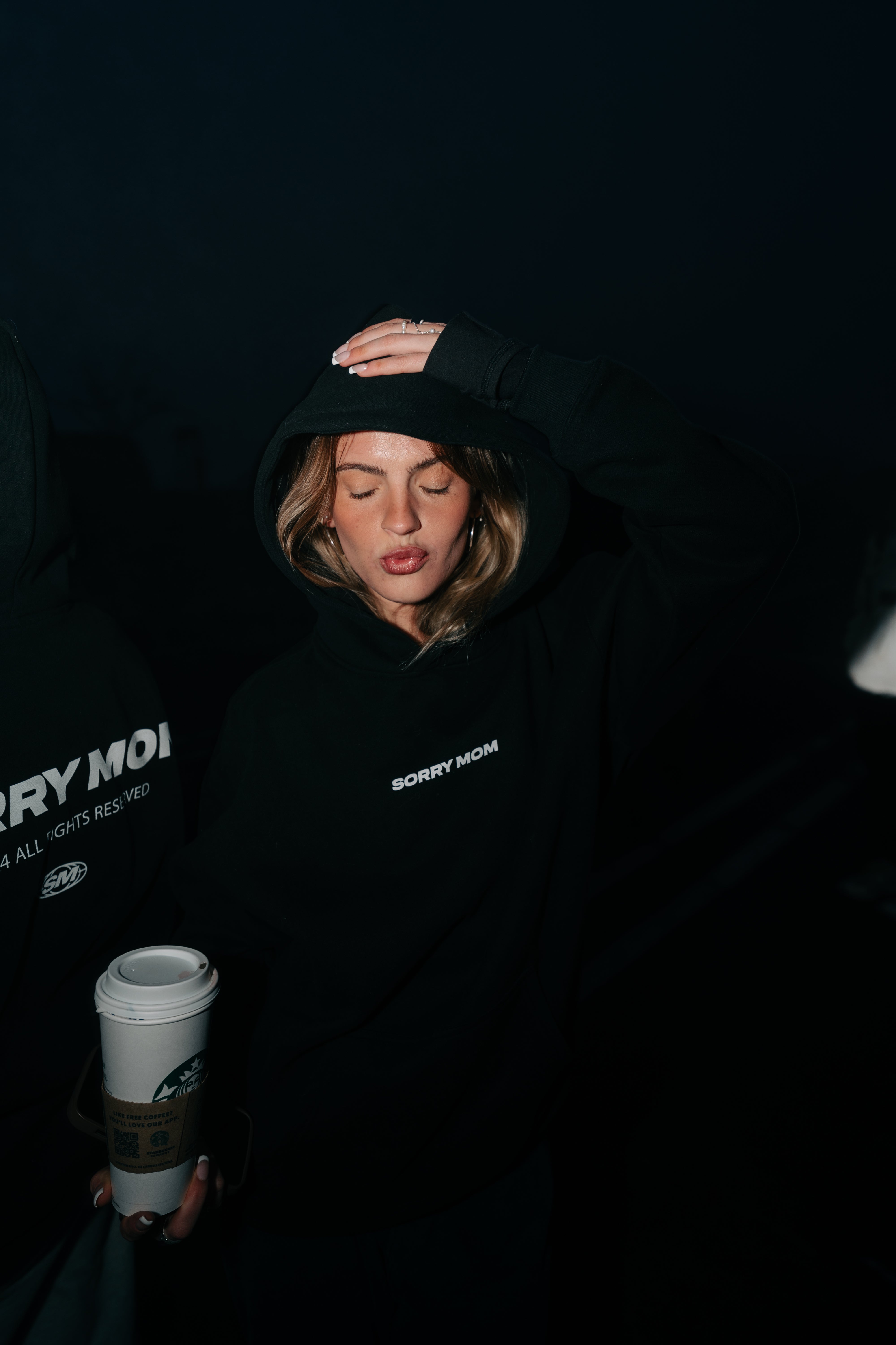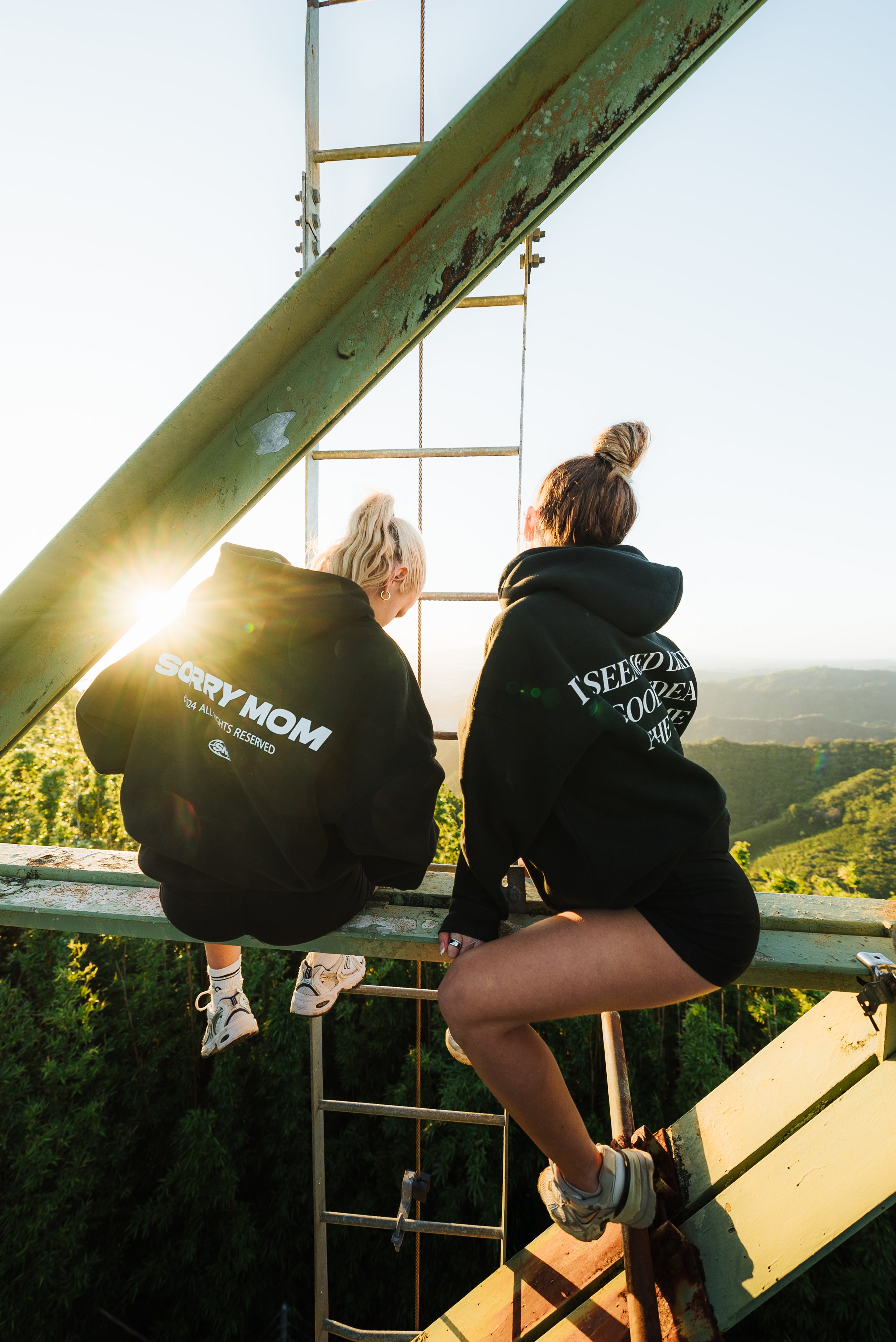No drawstrings, no compromises. Features a center chest print, bold back graphic, and custom labels reading “SORRY MOM - For risk-takers, by risk-takers.”